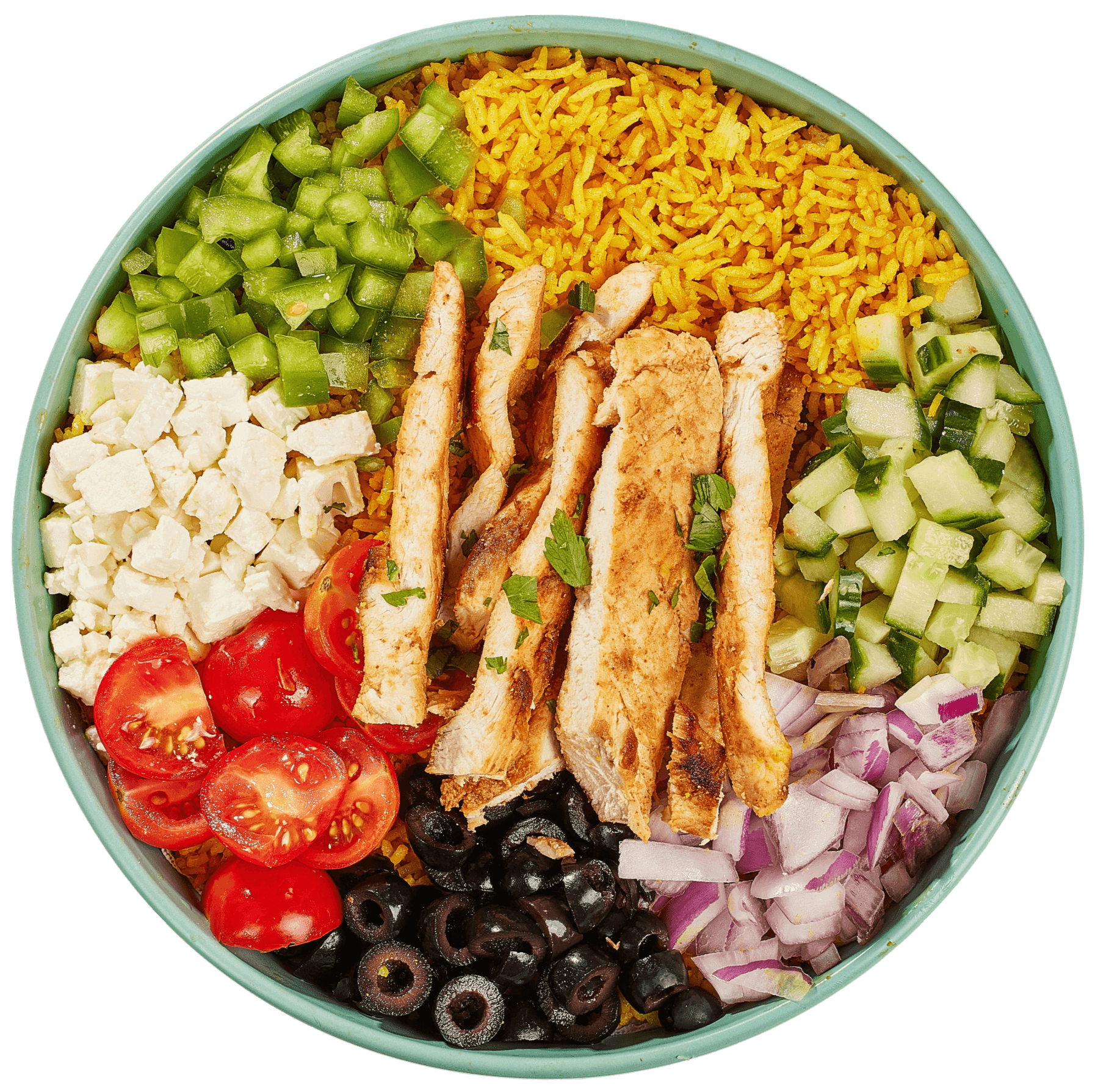 Bowl árabe con pollo, arroz integral con lentejas, tabule, hummus y pepino con aderezo a base de yogurt griego.